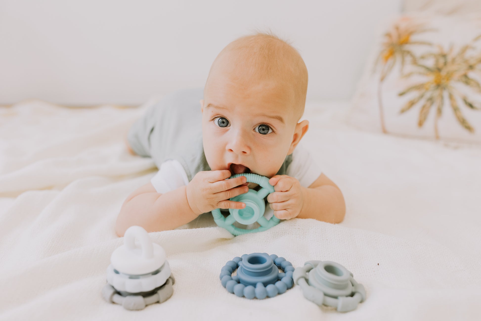Fáðu meira sólskin í daginn. Þessi verðlaunaði regnbogastaflturn og tanntökuverkfæri er fullkomið fjölnota leikfang. Barnið þitt mun fljótt uppgötva að stöflunarhringirnir eru besta lausnin til að róa auman góminn!