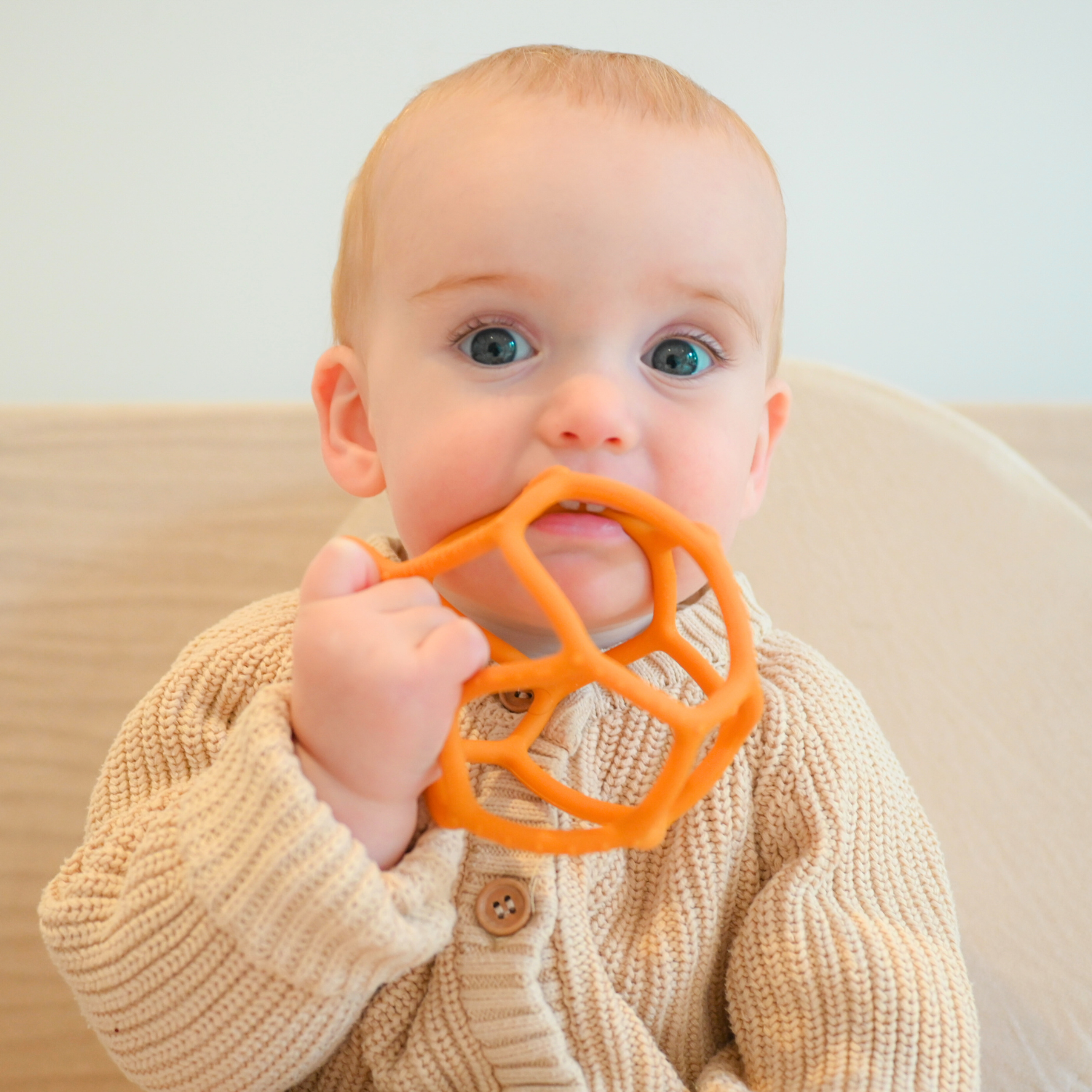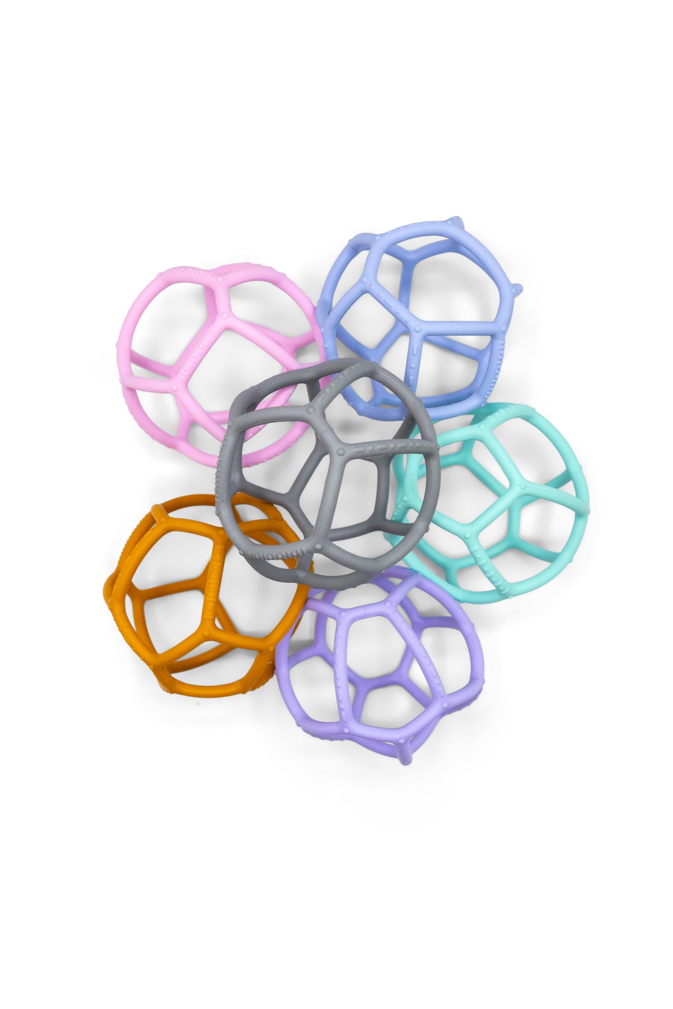 Skynjunarboltinn inniheldur engin óæskileg efni, hann er búinn til úr matvælasílikoni svo börn geta nagað mjúkt og öruggt yfirborð hans til að róa auman góminn. Opin hönnun skynjunarboltans hjálpar börnunum að ná góðu gripi á boltanum og bera hann að munninum þegar tennurnar láta til sín taka.